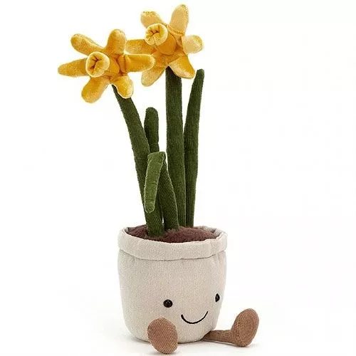‘Amuseable Daffodil’ van het Engelse merk Jellycat is een fleurige knuffelnarcis in een canvas potje. Met de vertederende glimlach, corduroy beentjes en zwarte kraaloogjes is het haast onmogelijk om niet verliefd te worden op dit knuffelbolgewas. Uit de bruine, pluche aarde steken vijf groene, corduroy bladeren, waarvan er twee eindigen in okergele, fluwelen trompetbloemen.