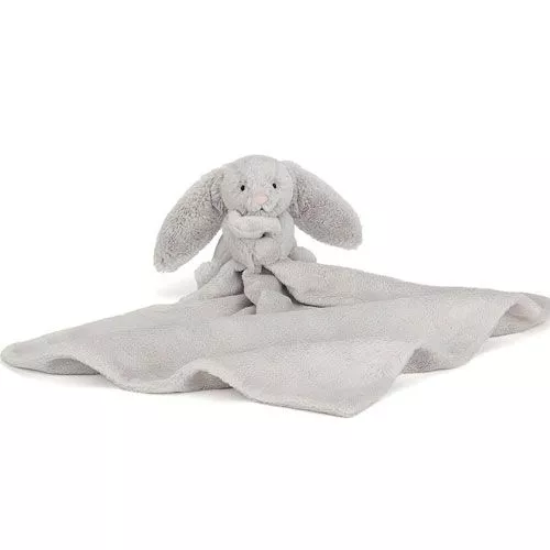 Deze Bashful Silver Bunny Soother van het Engelse merk Jellycat is een onweerstaanbaar knuffeldoekje voor kleine baby’s. Het speelkonijntje houdt de tut stevig vast. Het knuffeltje heeft geborduurde oogjes, een luxe fluweelzachte vacht. Het babydoekje is van dezelfde fluweelzachte stof als het konijntje, maar iets gladder. Met haar vroliijke oren en staart is zij gemakkelijk vast te pakken en het buikje is heerlijk zacht om in te knijpen.