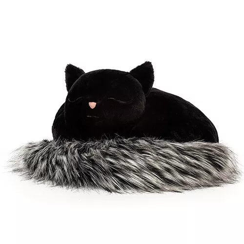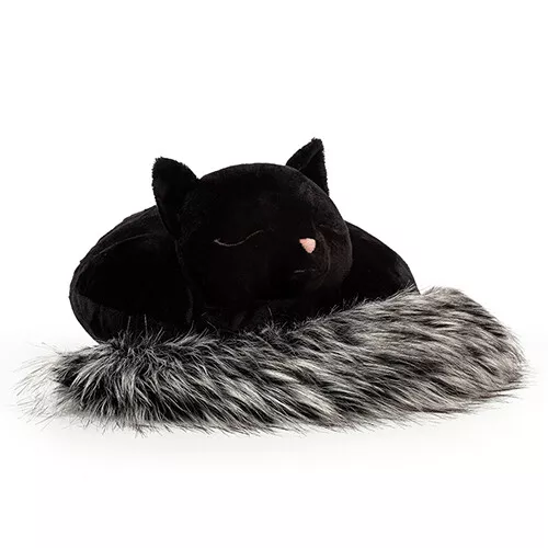 De poes heeft een diepzwarte, fluweelzachte gladde vacht, spitse oortjes en een onweerstaanbaar poezensnuitje met geborduurde oogjes. Haar flinke, pluizige staart dient als een knus nestje.