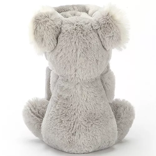 Deze ‘Snugglet Koala Soother’ van het Engelse merk Jellycat is een heel zacht knuffeldoekje met een kleine knuffelkoala. Het koalaknuffeltje met stralende kraaloogjes en pluizige oortjes houdt het doekje stevig vast.