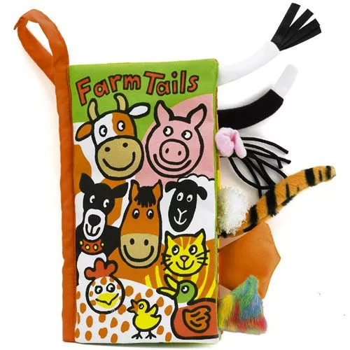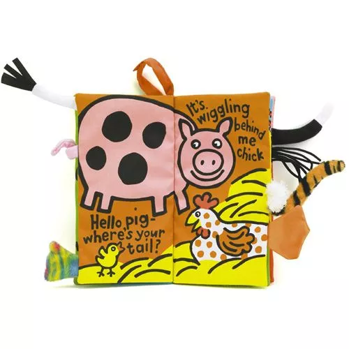 Een geweldig stoffen voelboekje van het merk Jellycat met staartjes van dieren op de boerderij, die allemaal van een andere stof zijn. Van wie is het roze krulstaartje? En bij wie hoort dat wollige staartje?