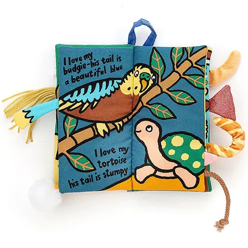 Een geweldig stoffen voelboekje van het merk Jellycat met staartjes van dieren in en om het huis, die allemaal anders zijn. Van wie is het rode staartje? En bij wie hoort de goudkleurige staart?